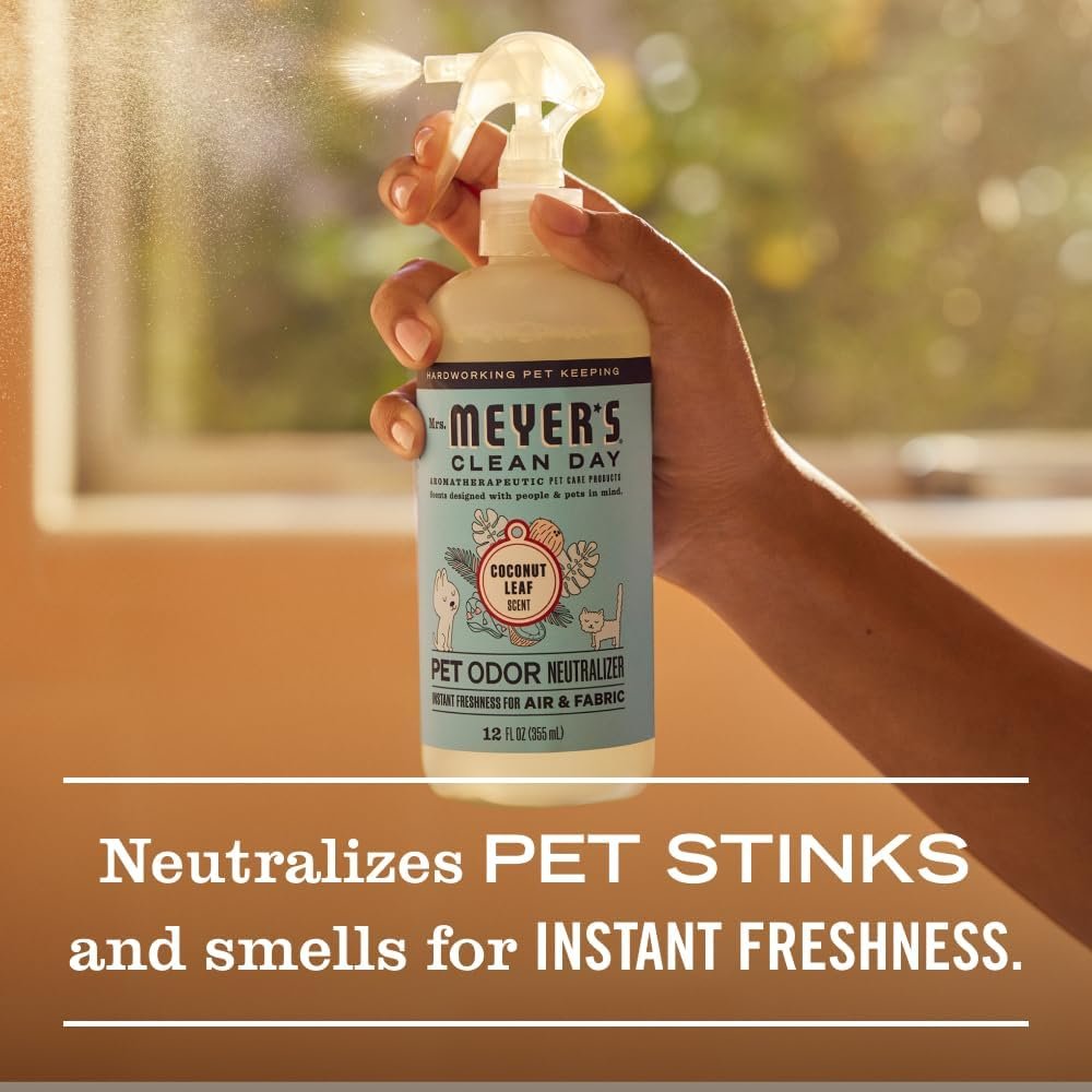 Refresh your home with MRS. MEYER'S CLEAN DAY Pet Odor Neutralizer, Coconut Leaf Scent, a hardworking spray designed to eliminate pet odors from hard-to-wash fabrics like carpets, bedding, and upholstery. Powered by effective odor-neutralizing technology and essential oils, this product tackles smells at their source, leaving behind a breezy, tropical coconut aroma. Made from USDA Biobased ingredients in cruelty-free, recyclable bottles, this neutralizer is safe for both pets and people, ensuring your space stays fresh and inviting. Trust Mrs. MEYER'S for a clean you and your furry friends will love.